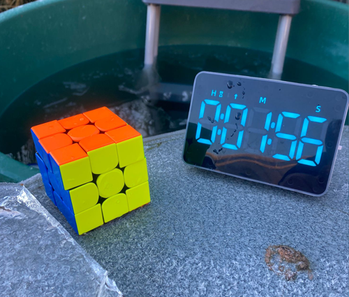 Mit vollständig untergetauchten Händen und Zauberwürfel im Eiswasser begann der Versuch. Die Kälte setzte sofort ein, die Zeit arbeitete gegen die Feinmotorik. Nach knapp unter zwei Minuten gelang es, den Würfel vollständig zu lösen – kurz bevor die Finger spürbar an Kontrolle verloren.