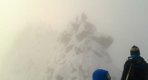 Da war er nun, der Kleinglocknergrat, kaum einen halben Meter breit, schneebedeckt. Links und rechts 1000m Abgrund. Zu sehen davon heute maximal 10m. Der Rest verschwand im Nebel.