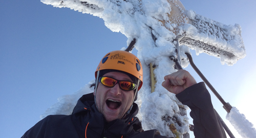 Und dann geschah etwas unglaubliches: der Nebel verschwand urplötzlich. Die Sonne kam heraus. Die letzten 30 Meter noch Klettern und dann lag das Gipfelkreuz vor uns. Völlig vereist. Ein Wahnsinniger Moment. Gefüllt mit einem kurzen Jubel. Die Freude über das Erreichte.